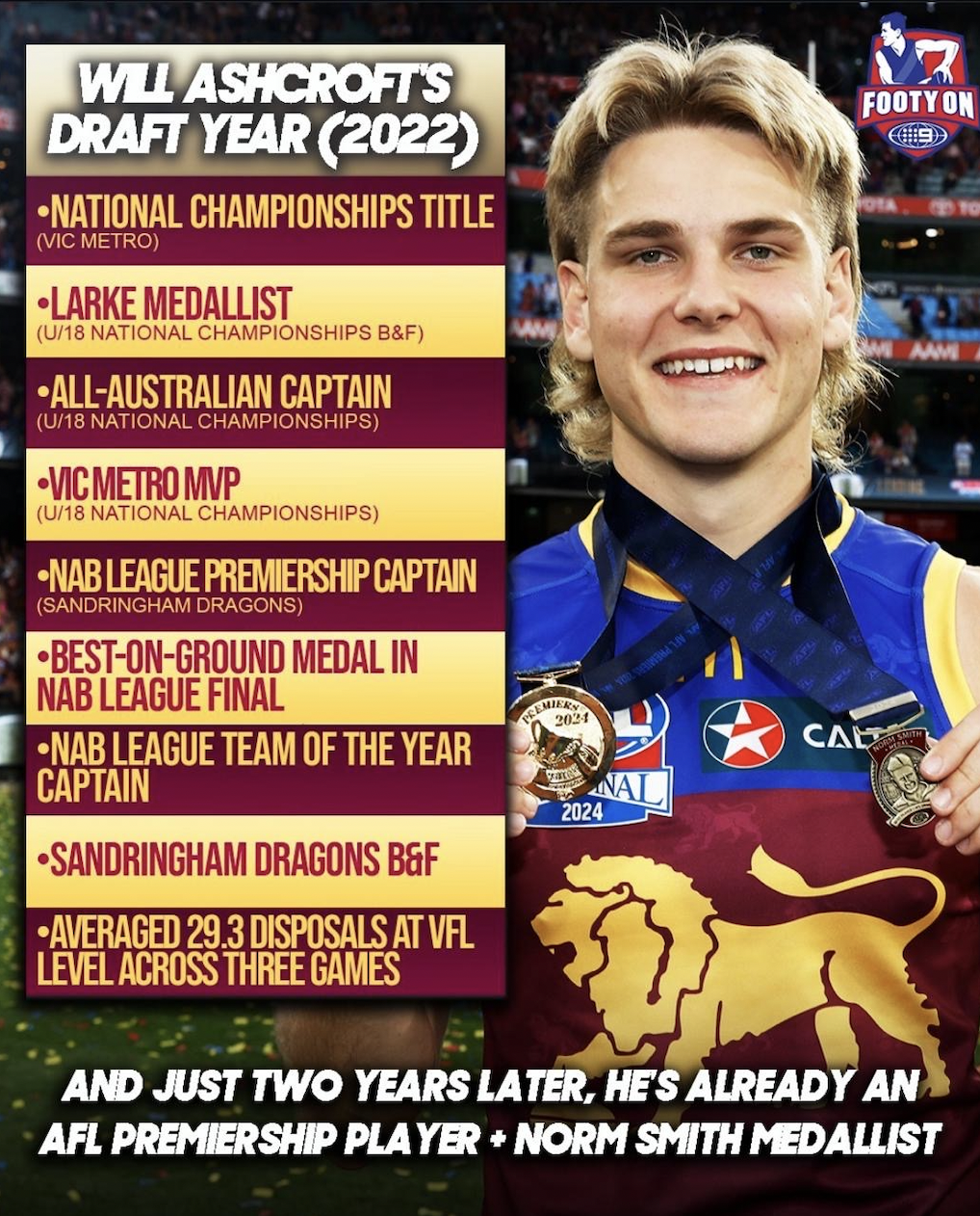 Despite being drafted in 2022, Ashcroft has amassed an impressive list of accolades. Before entering the AFL, he was already a standout player, earning honors such as: